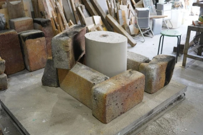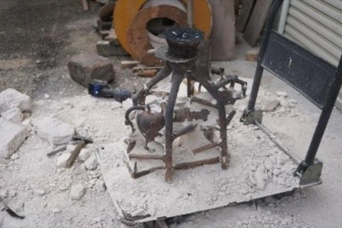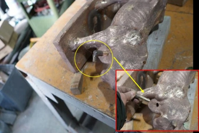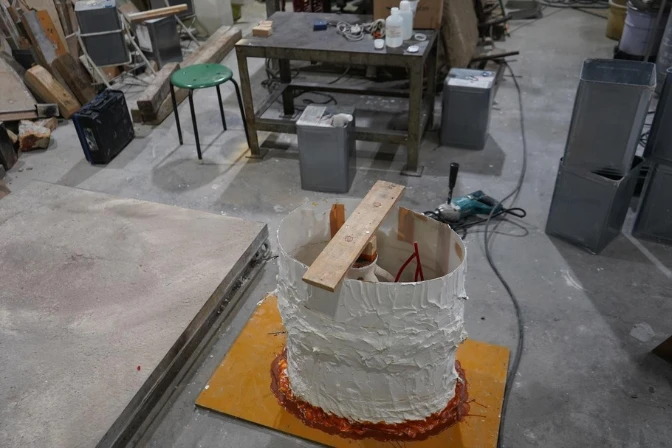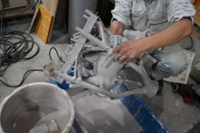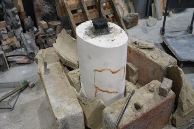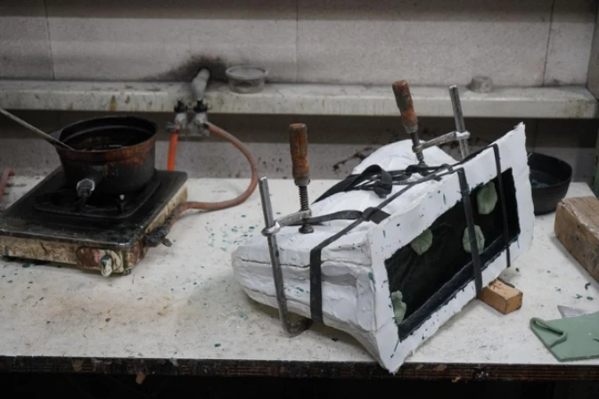 完成した鋳型を窯に入れて焼成し、脱ロウ(ロウを溶かして排出する)することで、鋳型内にブロンズ像の厚みとなる空間が用意されます。