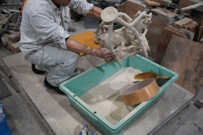 鋳造は、溶かした金属を型に流し込んで形を造る技法で、ロダンやブールデルも多くの作品をブロンズに鋳造しています。鋳造には様々な方法がありますが、今回用いたロウ型鋳造法(ロストワックス法)は、完成像となるモデルをロウ(ワックス)で作り、それを鋳型材でくるんで窯に入れ、ロウを溶かして除去した後の空洞に、金属を流し込んで像を作る方法です。