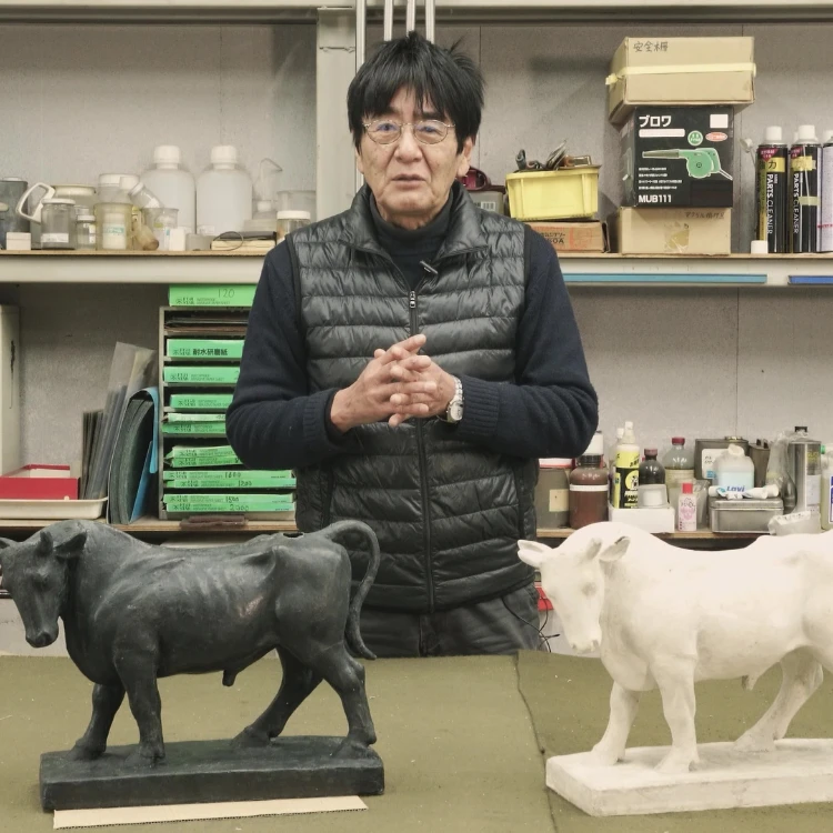 ご協力くださったのは、《牡牛》の作者である小室達(こむろ・とおる)氏に関しその功績・作品を後世に残すための活動をされている鈴木哲也氏(小室達顕彰会・柴田町文化財保護委員)です。鈴木氏は小室達氏のご子息である故・小室穰嗣(じょうじ)氏から《牡牛》を譲り受けられましたが、破損などのリスクが高い石膏像をブロンズ像にしたいという小室穰嗣氏のご遺志をかなえたいとお考えになっていました。そこにちょうど当館の動画制作のお話があり、工程の説明のための題材として撮影を行わせていただける運びとなりました。なお、鋳造については、鈴木氏と小室穰嗣氏のご夫人・小室弘子氏の連名にて実施しております。